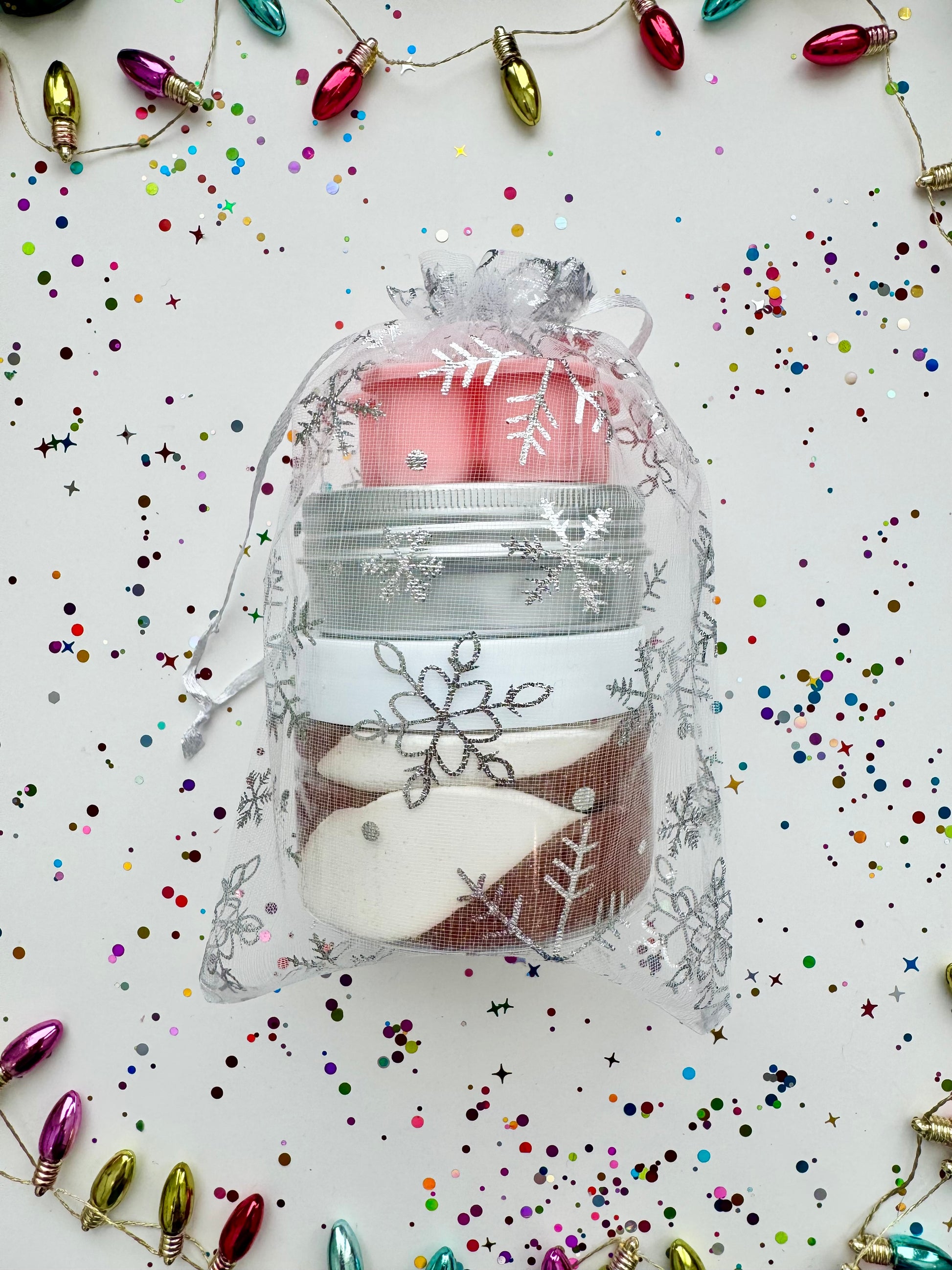 Mini Kit - 7 oz jar of Spiced Glow swirl dough, a tin of assorted loose parts, and an assorted dough stamper placed inside of an organza bag.